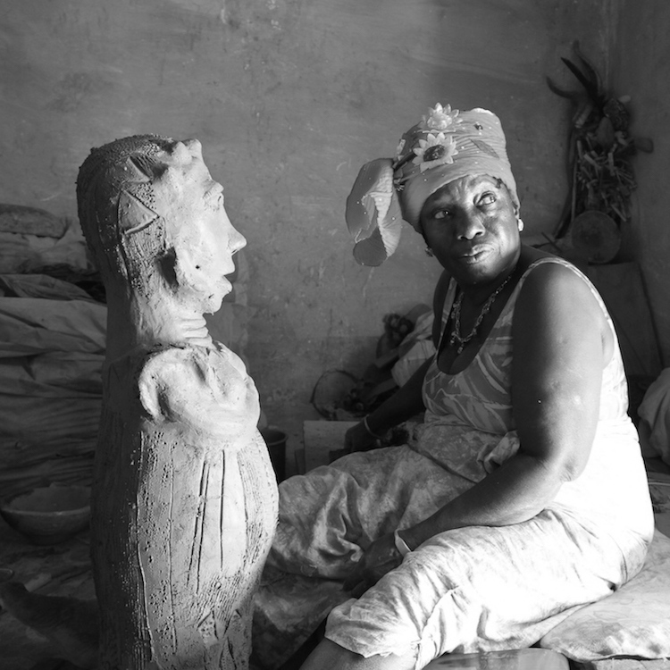 Seni Awa Camara belongs to a group of artists who were introduced to the African contemporary art scene in 1989 with the exhibition Magiciens de la terre (Magicians of the Earth), and whose works were acquired and distributed by Jean Pigozzi after the exhibition. Like several other artists exhibited in 1989, S. A. Camara had no international plans for her work, rather choosing to restrict her production to the local market of Bignona, the Casamancian village where she was born. While she still lives there, S. A. Camara now exports her sculptures worldwide. Halfway between arts and crafts and naïve art, her creations are a pure product of her imagination, for which she feels no need to justify origins, meanings or possible interpretations. Sculpted in the shape of strange, sometimes two-headed creatures, often from a single trunk and carrying multiple bodies of children or animals, her sculptures evoke maternity scenes and draw from the natural environment of the Casamance region and from a diverse bestiary.