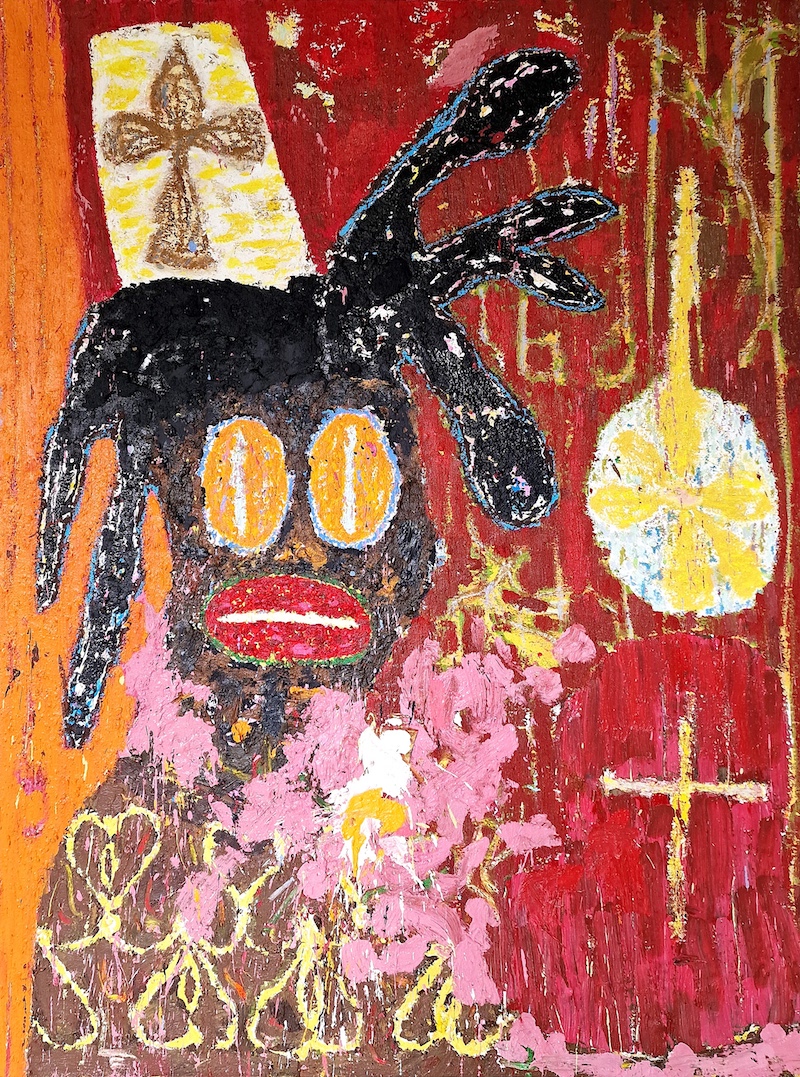 Kabangu’s paintings reconcile the sublime with the grotesque, light with darkness, memory with imagined futures. He masterfully combines acrylic, oil, and pastel to choreograph a vibrant chromatic spectrum—from pastel pink and sugar-paper blue to orange, leaf green, crimson, and black—applied with brushes, palette knives, and fingers to evoke ecstatic, pop-infused vitality.