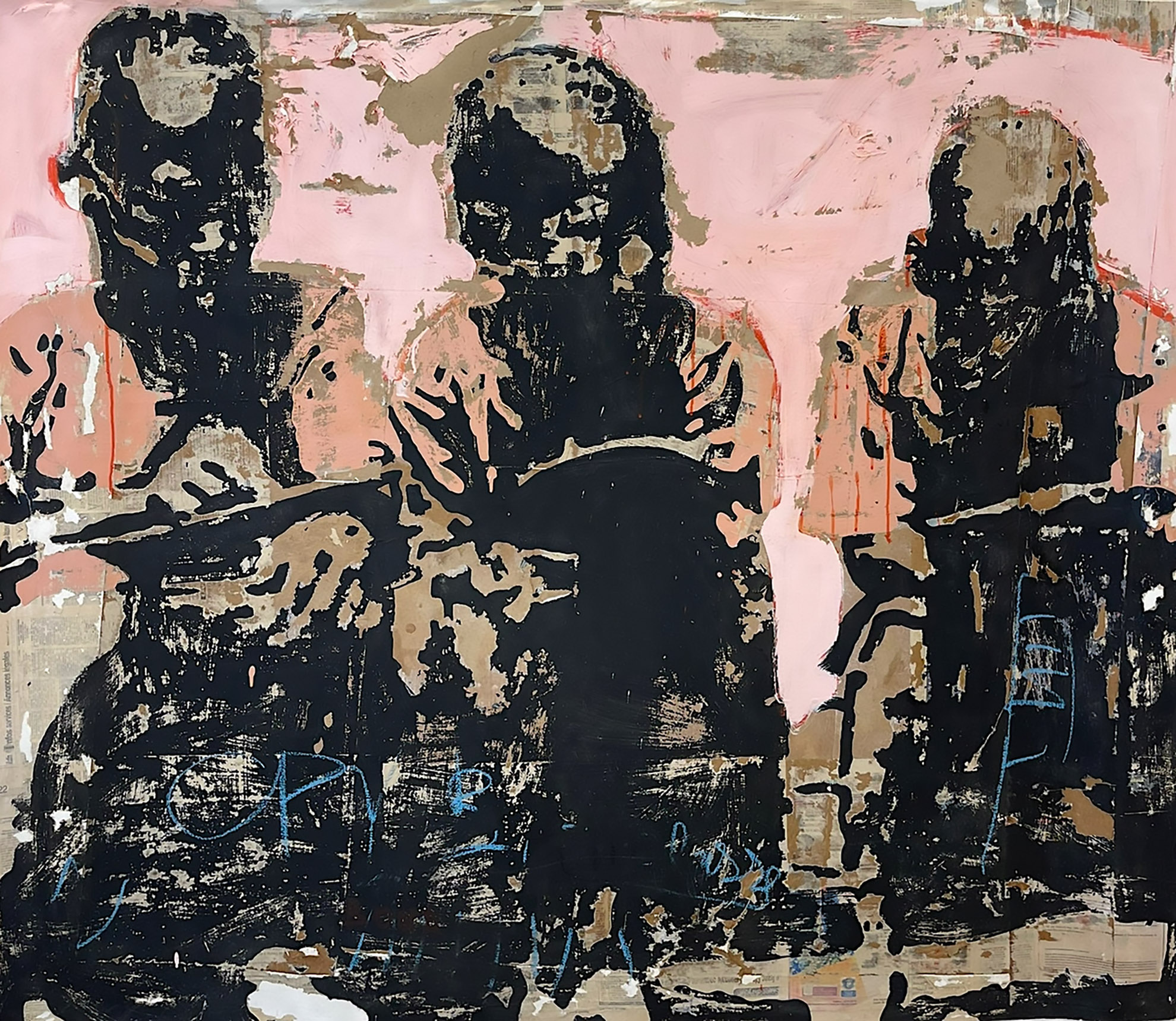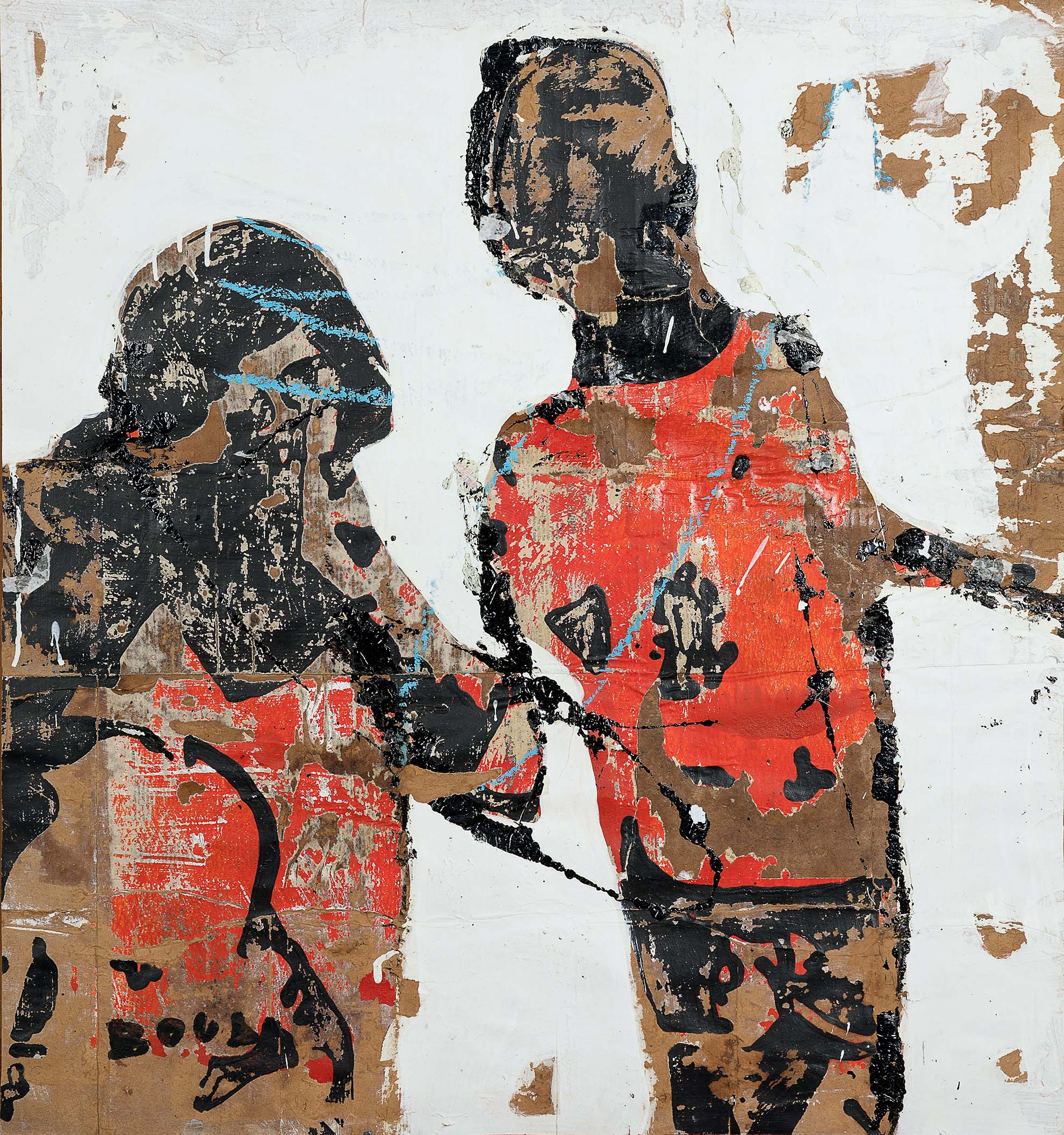 The compositions of Armand Boua are distinguished by a structured processing thanks to the use of tar, acrylic, newsprint and magazines mixed with recycled materials. Each layer is applied and then torn, stripped, revealing abstract shapes.