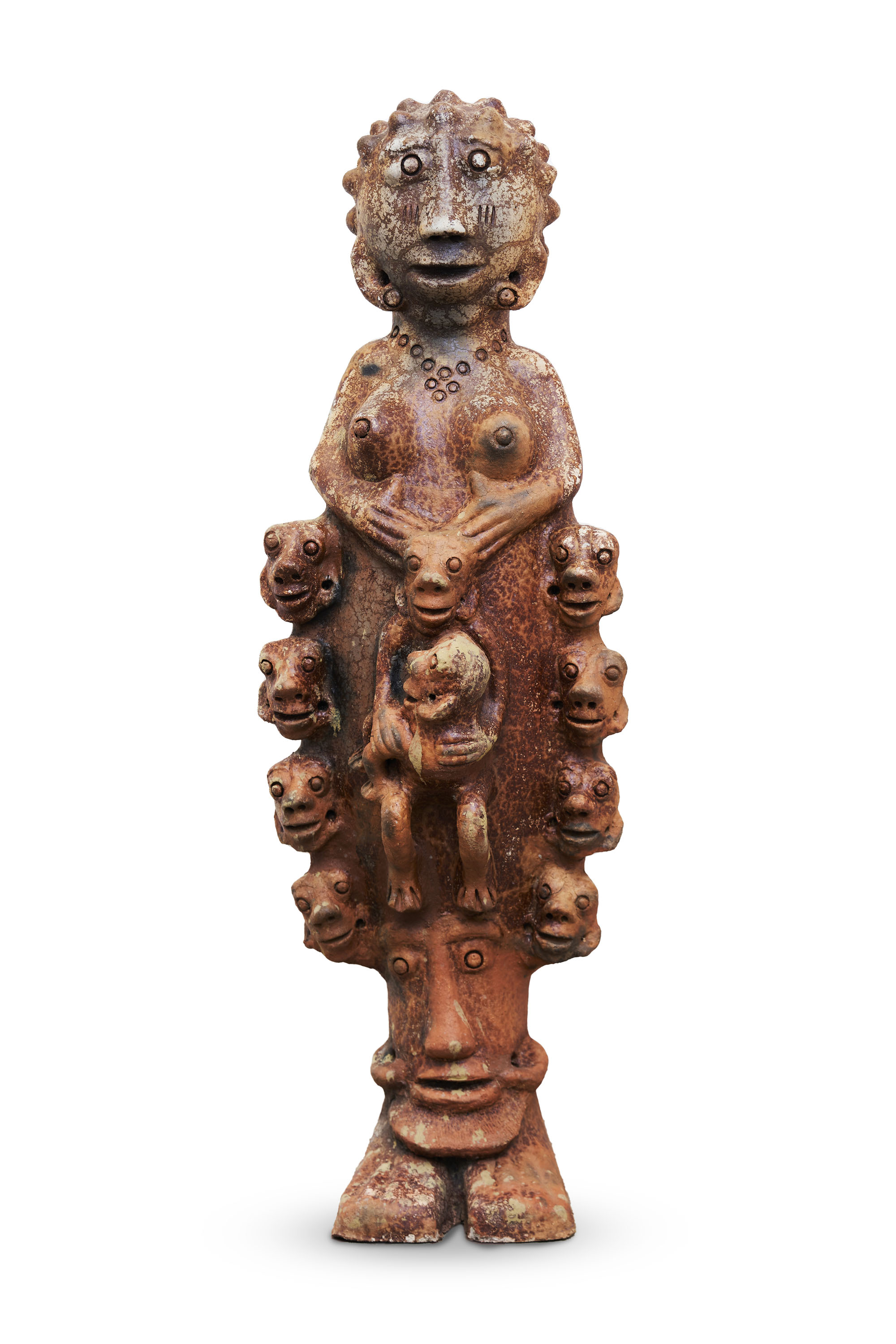 Seni Awa Camara belongs to a group of artists who were introduced to the African contemporary art scene in 1989 with the exhibition Magiciens de la terre (Magicians of the Earth), and whose works were acquired and distributed by Jean Pigozzi after the exhibition. Like several other artists exhibited in 1989, S. A. Camara had no international plans for her work, rather choosing to restrict her production to the local market of Bignona, the Casamancian village where she was born. While she still lives there, S. A. Camara now exports her sculptures worldwide. Halfway between arts and crafts and naïve art, her creations are a pure product of her imagination, for which she feels no need to justify origins, meanings or possible interpretations. Sculpted in the shape of strange, sometimes two-headed creatures, often from a single trunk and carrying multiple bodies of children or animals, her sculptures evoke maternity scenes and draw from the natural environment of the Casamance region and from a diverse bestiary.