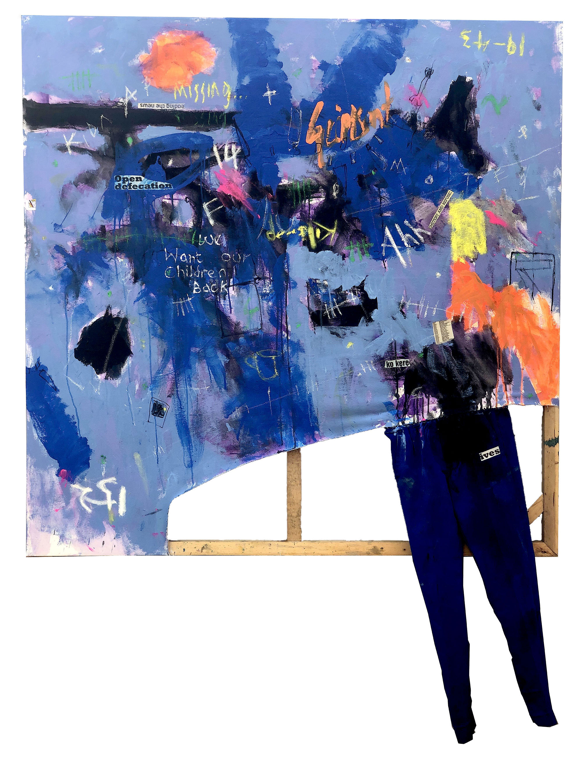 acrylic, oil, bar and newspaper cut on canvas