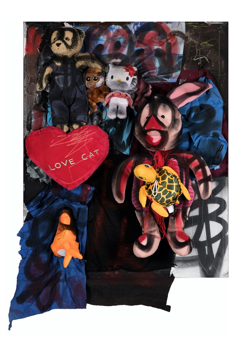 Acrylic, oil stick, spray and paper collage on canvas